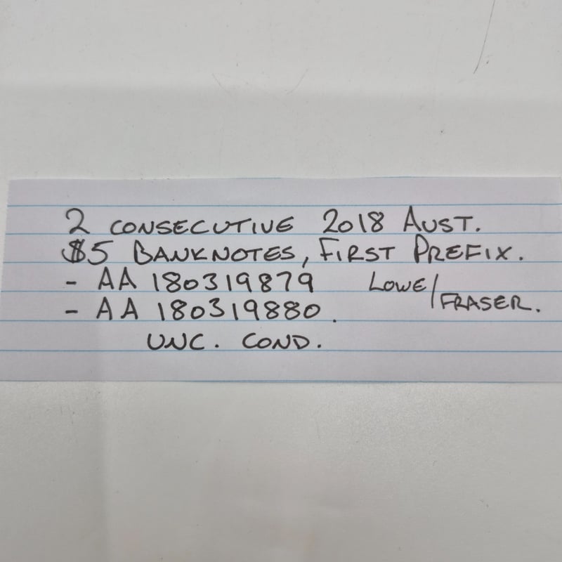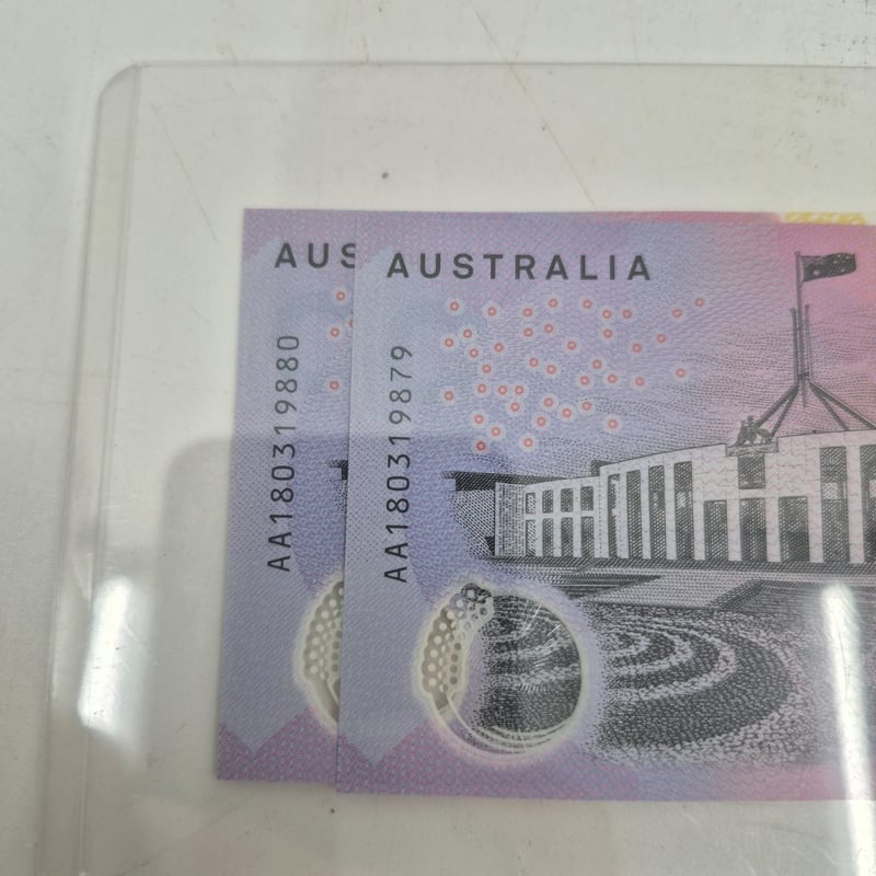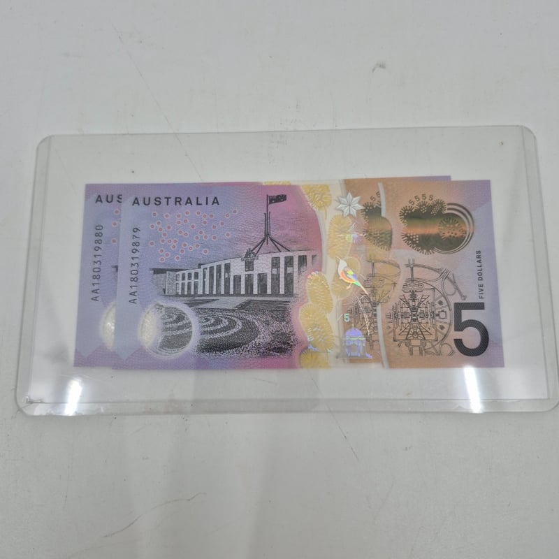 X2 CONSECUTIVE 2018 AUSTRALIAN $5 NOTES, FIRST PREFIX