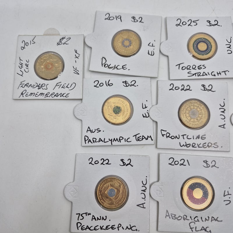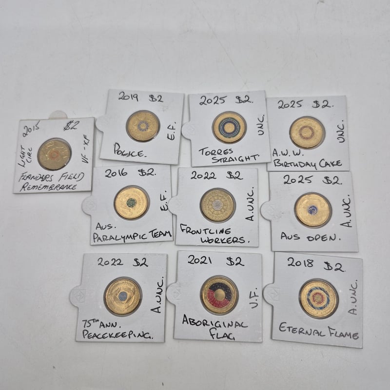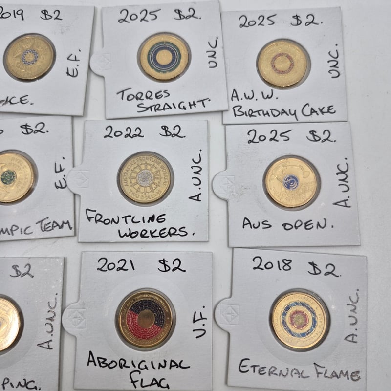 ASSORTED AUSTRALIAN COLOURED $2 COINS INCLUDING 2022 FRONTLINE WORKERS, 2025 AUS OPEN, 2018 ETERNAL FLAME AND MORE