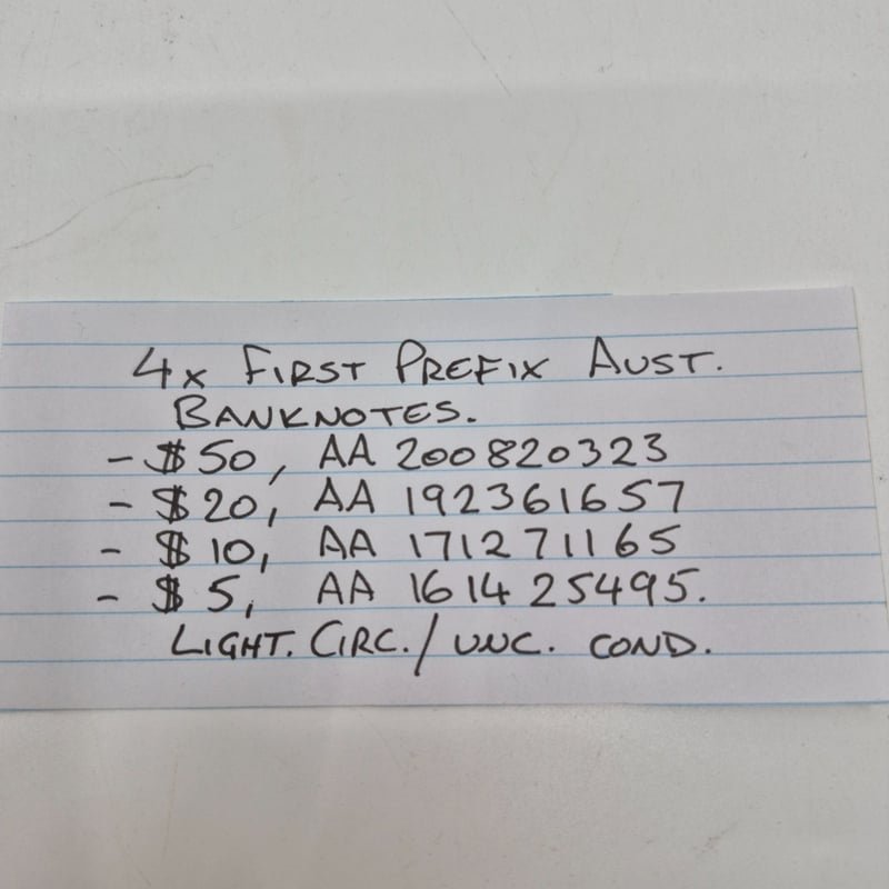 FIRST PREFIX AUSTRALIAN BANK NOTES $50, $20, $10 & $5