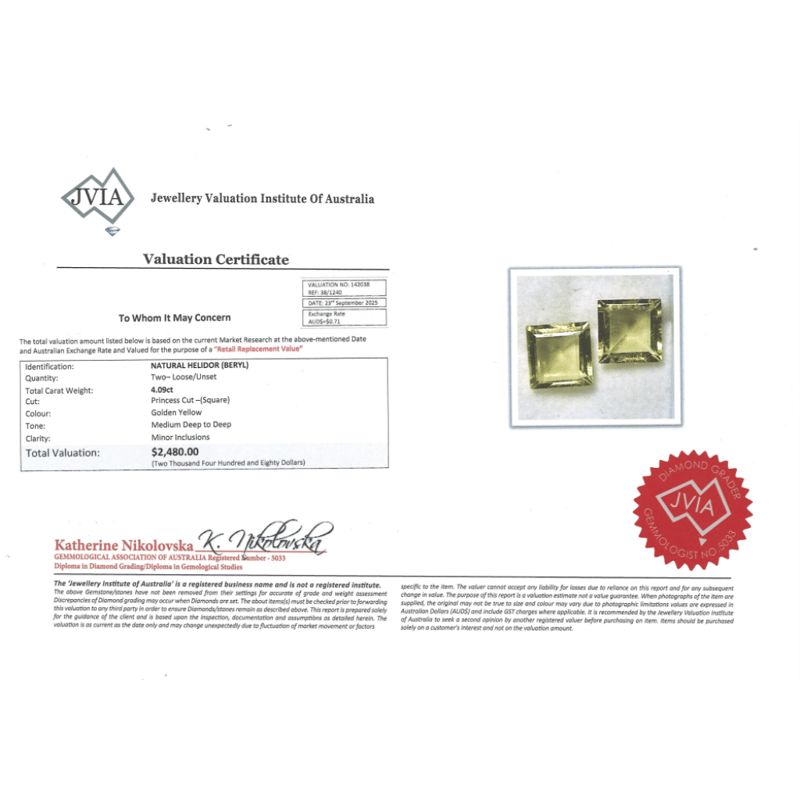 4.09CT TSW X 2, NATURAL BERYL HELIODORS, Princess Cut, Medium-Deep Golden Yellow, Minor Inclusions, Loose, Unset. Valuations Provided by an Independent Third-Party Professional Not Directly Associated With Lloyds Auctions at AUD $$2,480.00This valuation has been conducted by an independent third-party professional. The valuation amount is an assessment by the issuing valuer and does not reflect the auction value of the item. Any inquiries regarding the valuation should be directed to the issuing valuer (refer to contact details on the certificate), as Lloyds Auctions has no affiliation or influence over the valuation, the valuer, or the stated amount. Condition: Good - Refer Images 0+2027