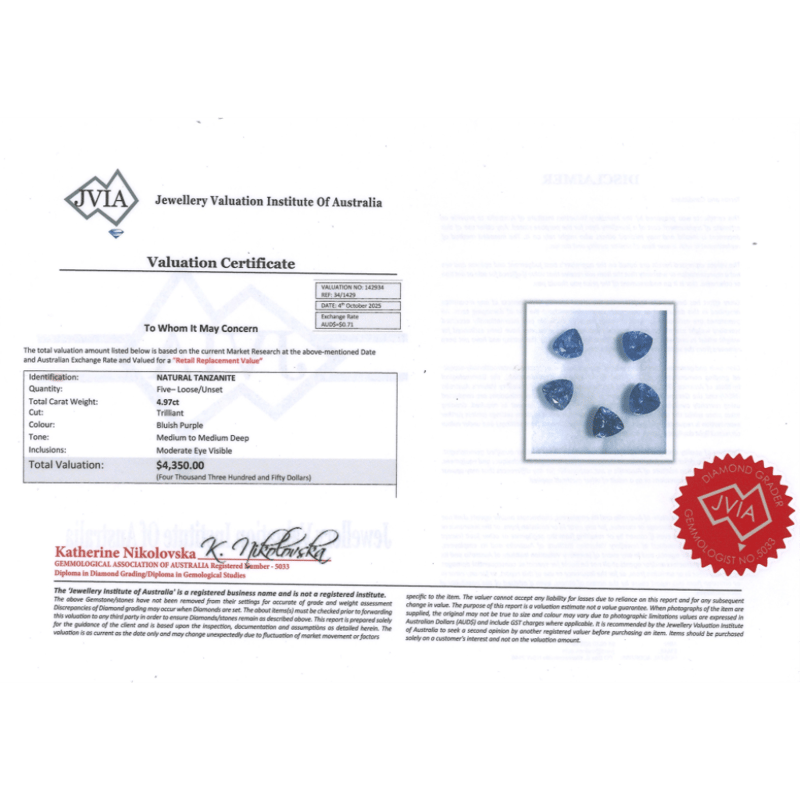 4.97CT TSW X 5, NATURAL TANZANITES, Trilliant Cut, Medium-Deep Bluish-Purple, Moderate Eye Visible Inclusions, Loose, Unset. Valuations Provided by an Independent Third-Party Professional Not Directly Associated With Lloyds Auctions at AUD $$4,350.00This valuation has been conducted by an independent third-party professional. The valuation amount is an assessment by the issuing valuer and does not reflect the auction value of the item. Any inquiries regarding the valuation should be directed to the issuing valuer (refer to contact details on the certificate), as Lloyds Auctions has no affiliation or influence over the valuation, the valuer, or the stated amount. Condition: Good - Refer Images 0+2031