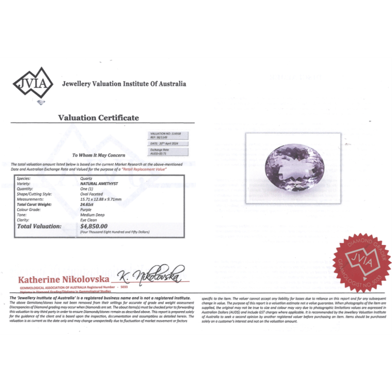 Oval Faceted Cut, Medium-Deep Purple, Eye Clean Clarity, Loose, Unset.