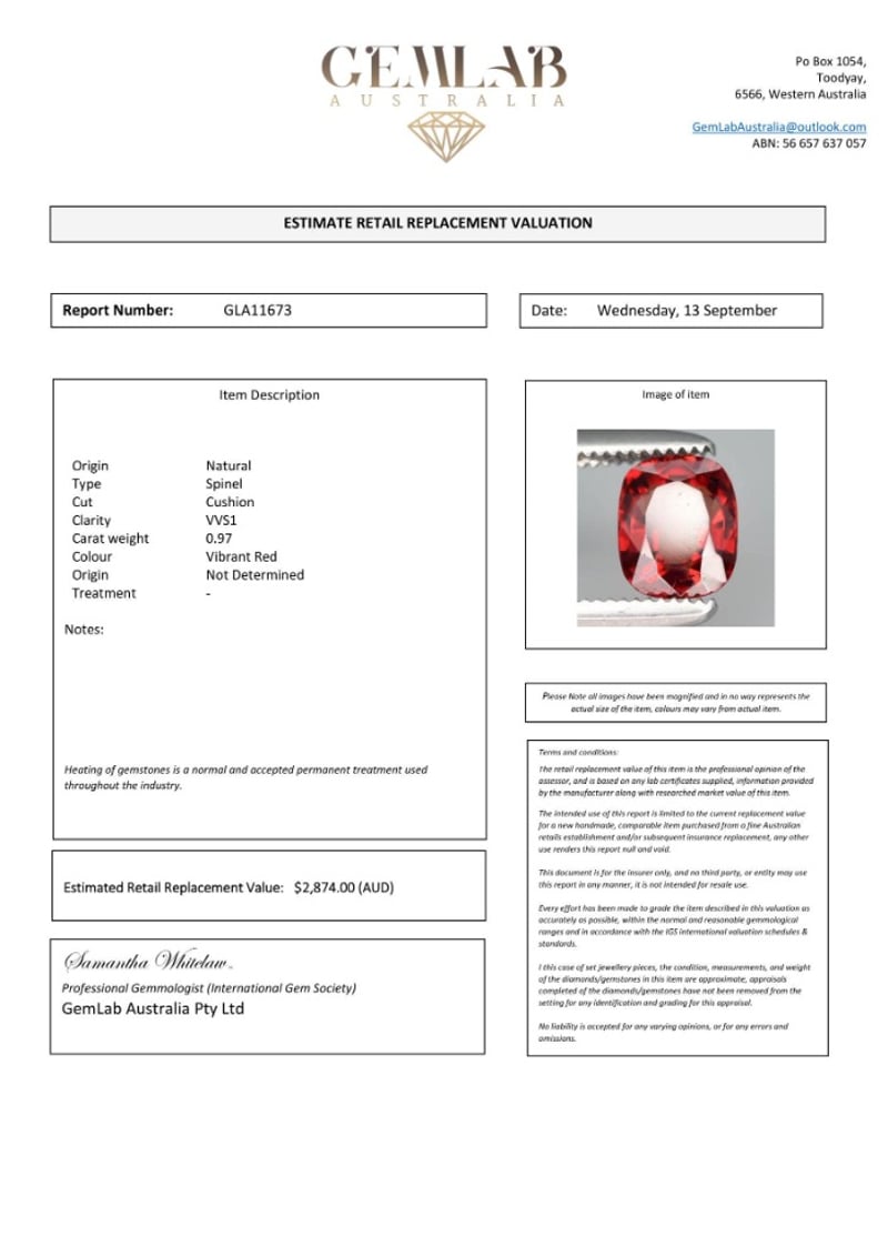 0.97CT CUSHION CUT SPINEL CLARITY: VVS1 JEWELLERY VALUATIONS PROVIDED BY A THIRD PARTY PROFESSIONAL NOT DIRECTLY ASSOCIATED WITH LLOYDS AUCTIONS AT $2874 THIS INSURANCE VALUATION HAS BEEN PROVIDED BY A REGISTERED JEWELLERY VALUER AND IS INTENDED FOR INSURANCE PURPOSES ONLY. THE VALUATION AMOUNT HAS NO BEARING ON THE AUCTION VALUE OF THE ITEM. ANY QUESTIONS REGARDING THE VALUATION SHOULD BE DIRECTED TO THE ISSUING VALUER (REFER TO CONTACT DETAILS ON THE CERTIFICATE) AS LLOYDS HAVE NO ASSOCIATION OR RELATIONSHIP WITH THE VALUER OR THE VALUATION AMOUNT CONTAINED WITHIN THE VALUATION. 232846+7