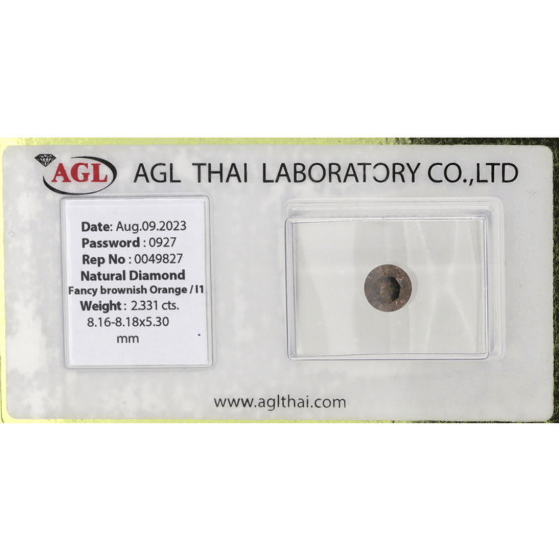 2.331CT CERTIFIED, FANCY ORANGE DIAMOND Round Brilliant Cut, Fancy Brownish-Orange, I1 Clarity, Loose, Unset. Stone Comes Sealed With Agl Report: 0049827. Jewellery Valuations Provided By A Third Party Professional Not Directly Associated With Lloyds Auctions at AUD $27,700.00This Insurance Valuation has been provided by a registered Jewellery Valuer and is intended for insurance purposes only. The valuation amount has no bearing on the auction value of the item. Any questions regarding the valuation should be directed to the issuing Valuer (refer to contact details on the certificate) as Lloyds have no association or relationship with the Valuer or the valuation amount contained within the valuation. Condition: GOOD 0645902+2123