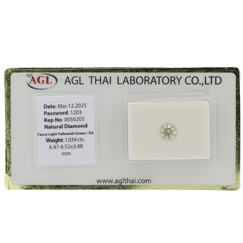 1.034CT CERTIFIED, NATURAL FANCY YELLOW/GREEN DIAMOND Round Brilliant Cut, Light Fancy Yellowish-Green Colour, Si2 Clarity, Loose, Unset. Stone Comes Sealed With Agl Report: 0056203. Jewellery Valuations Provided By A Third Party Professional Not Directly Associated With Lloyds Auctions at AUD $18,000.00This Insurance Valuation has been provided by a registered Jewellery Valuer and is intended for insurance purposes only. The valuation amount has no bearing on the auction value of the item. Any questions regarding the valuation should be directed to the issuing Valuer (refer to contact details on the certificate) as Lloyds have no association or relationship with the Valuer or the valuation amount contained within the valuation. Condition: GOOD 0645902+2113