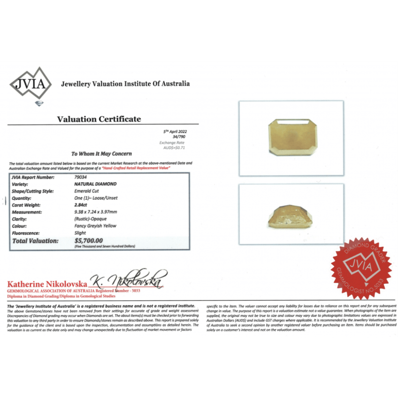 2.84CT NATURAL FANCY YELLOW DIAMOND Emerald Cut, Fancy Greyish-Yellow, Opaque, Loose, Unset. Jewellery Valuations Provided By A Third Party Professional Not Directly Associated With Lloyds Auctions at AUD $5,700.00This Insurance Valuation has been provided by a registered Jewellery Valuer and is intended for insurance purposes only. The valuation amount has no bearing on the auction value of the item. Any questions regarding the valuation should be directed to the issuing Valuer (refer to contact details on the certificate) as Lloyds have no association or relationship with the Valuer or the valuation amount contained within the valuation. Condition: GOOD 0645902+2153