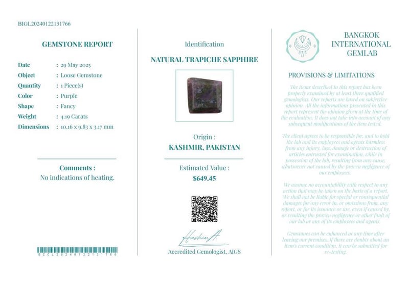 5.02 CARATS CERTIFIED NATURAL TRAPICHE SAPPHIRE Gemstone : Natural Trapiche SapphireCertificate Number : Bigl20240122131766Weight : 5.02 CaratsColor : PurpleMeasurement : 10.09 X 7.93 X 5.56 MmShape : Rectangle StepQuantity : 1 PieceOrigin : Kashmir, PakistanComments : No Indications Of Heating.• Use The Qr Code On The Packaging To View And Download The Certificate. • Verify Report Online At Www.Bangkokinternationalgemlab.Co 0+4