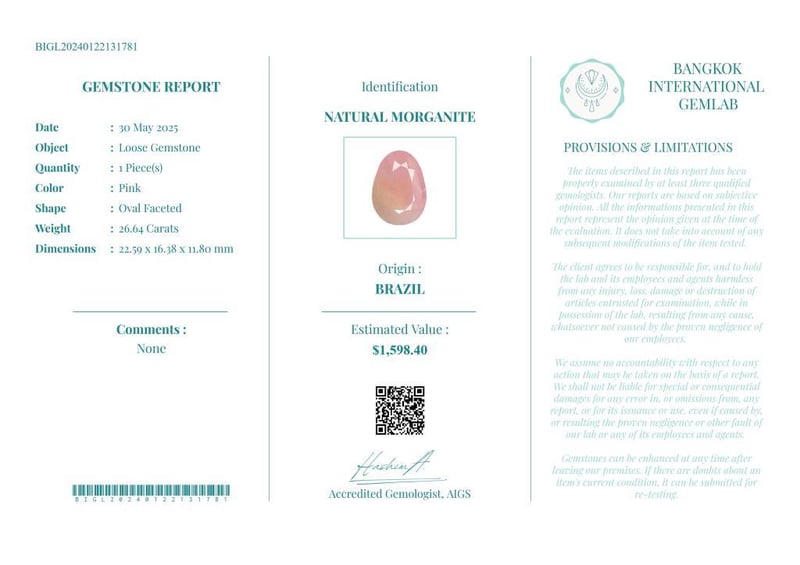26.64 CARATS CERTIFIED NATURAL MORGANITE Gemstone : Natural MorganiteCertificate Number : Bigl20240122131781Weight : 26.64 CaratsColor : PinkMeasurement : 22.59 X 16.38 X 11.80 MmShape : Oval FacetedQuantity : 1 PieceOrigin : BrazilComments : None• Use The Qr Code On The Packaging To View And Download The Certificate. • Verify Report Online At Www.Bangkokinternationalgemlab.Co 0+5