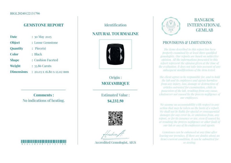 33.86 CARATS CERTIFIED NATURAL TOURMALINE Gemstone : Natural TourmalineCertificate Number : Bigl20240122131796Weight : 33.86 CaratsColor : BlackMeasurement : 20.03 X 16.80 X 12.02 MmShape : Cushion FacetedQuantity : 1 PieceOrigin : MozambiqueComments : No Indications Of Heating.• Use The Qr Code On The Packaging To View And Download The Certificate. • Verify Report Online At Www.Bangkokinternationalgemlab.Co 0+6