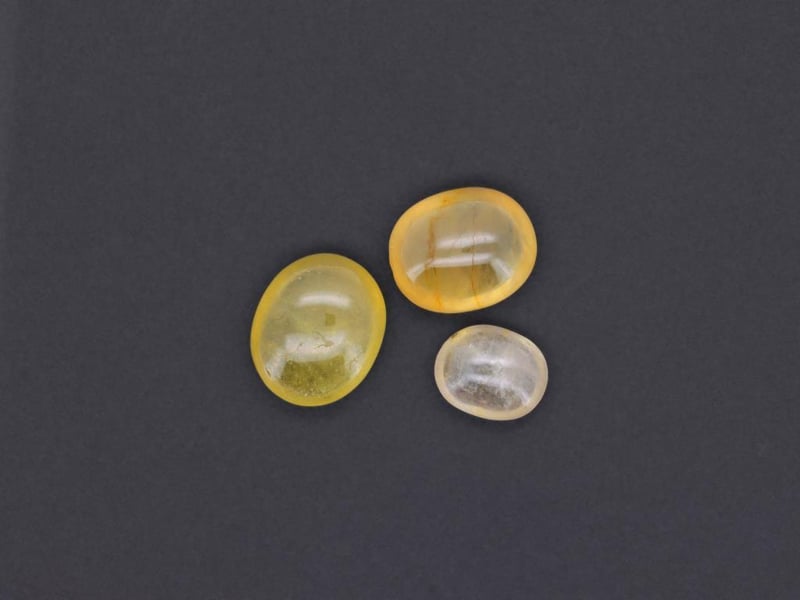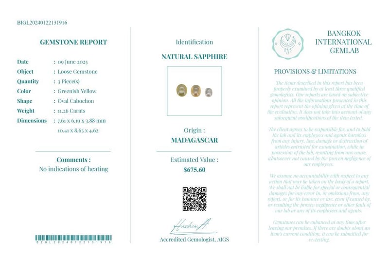 11.26 CARATS CERTIFIED NATURAL SAPPHIRE Gemstone : Natural SapphireCertificate Number : Bigl20240122131916Weight : 11.26 CaratsColor : Greenish YellowMeasurement : 7.61 X 6.19 X 3.88 MmShape : Oval CabochonQuantity : 3 PieceOrigin : MadagascarComments : No Indications Of Heating• Use The Qr Code On The Packaging To View And Download The Certificate. • Verify Report Online At Www.Bangkokinternationalgemlab.Co 0+14
