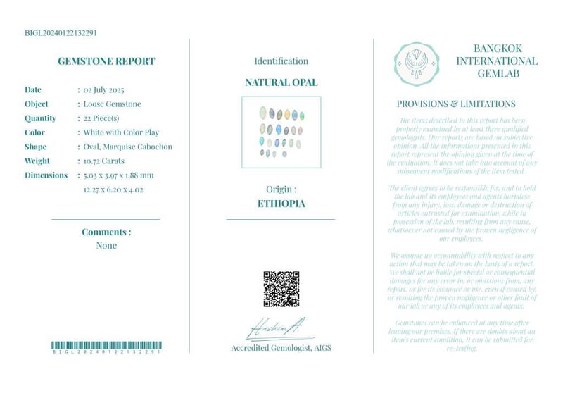 10.72 CARATS CERTIFIED NATURAL OPAL Gemstone : Natural OpalCertificate Number : Bigl20240122132291Weight : 10.72 CaratsColor : White With Color PlayMeasurement : 5.03 X 3.97 X 1.88 MmShape : Oval, Marquise CabochonQuantity : 22 PieceOrigin : EthiopiaComments : None• Use The Qr Code On The Packaging To View And Download The Certificate. • Verify Report Online At Www.Bangkokinternationalgemlab.Co 0+39