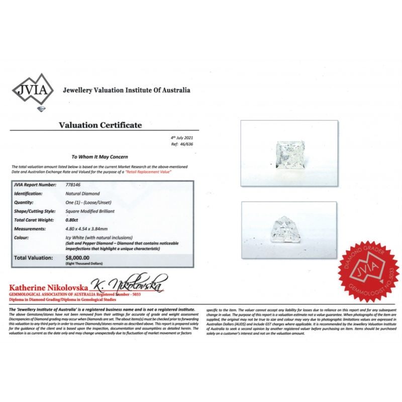 0.80CT NATURAL DIAMOND Square Modified Brilliant Cut, Icy White, Natural Inclusions, Loose, Unset. Valuations Provided by an Independent Third-Party Professional Not Directly Associated With Lloyds Auctions at AUD $$8,000.00This valuation has been conducted by an independent third-party professional. The valuation amount is an assessment by the issuing valuer and does not reflect the auction value of the item. Any inquiries regarding the valuation should be directed to the issuing valuer (refer to contact details on the certificate), as Lloyds Auctions has no affiliation or influence over the valuation, the valuer, or the stated amount. Condition: Good - Refer Images 0645906+2257