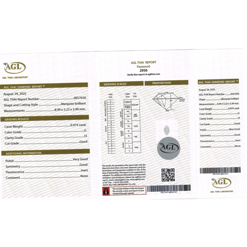 0.974CT CERTIFIED, NATURAL DIAMOND Marquise Brilliant Cut, G Colour, I3 Clarity, Loose, Unset. Stone Comes Sealed With Agl Report: 0057656. Valuations Provided by an Independent Third-Party Professional Not Directly Associated With Lloyds Auctions at AUD $$10,200.00This valuation has been conducted by an independent third-party professional. The valuation amount is an assessment by the issuing valuer and does not reflect the auction value of the item. Any inquiries regarding the valuation should be directed to the issuing valuer (refer to contact details on the certificate), as Lloyds Auctions has no affiliation or influence over the valuation, the valuer, or the stated amount. Condition: Good - Refer Images 0645906+2204