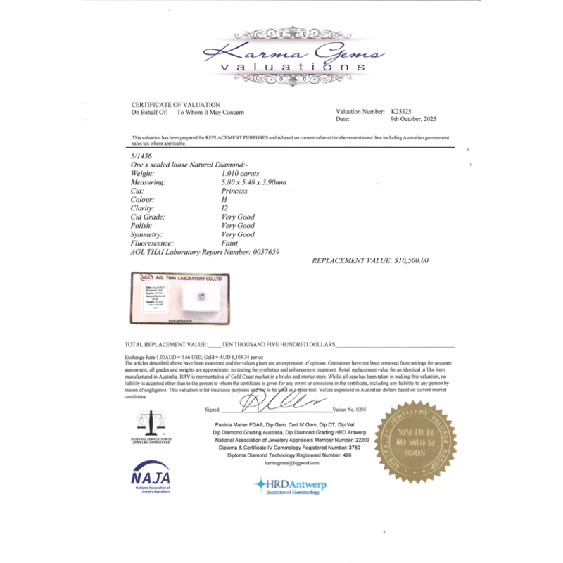 1.01CT CERTIFIED, NATURAL DIAMOND Princess Cut, H Colour, I2 Clarity, Loose, Unset. Stone Comes Sealed With Agl Report: 0057666. Valuations Provided by an Independent Third-Party Professional Not Directly Associated With Lloyds Auctions at AUD $$10,500.00This valuation has been conducted by an independent third-party professional. The valuation amount is an assessment by the issuing valuer and does not reflect the auction value of the item. Any inquiries regarding the valuation should be directed to the issuing valuer (refer to contact details on the certificate), as Lloyds Auctions has no affiliation or influence over the valuation, the valuer, or the stated amount. Condition: Good - Refer Images 0645906+2206