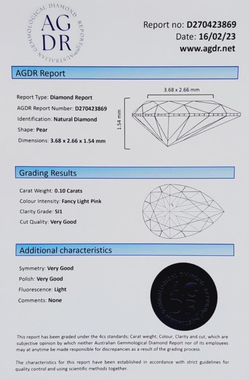 Shape: Pear, Colour Intensity: Fancy Light Pink, Clarity Grade: Si1, Cut Quality: Very Good, Symmetry: Very Good, Polish: Very Good, Fluorescence: Light As Per Agdr Report Number: D270423869.