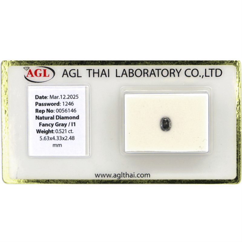0.521CT CERTIFIED, NATURAL FANCY GREY DIAMOND Oval Brilliant Cut, Fancy Grey, I1 Clarity, Loose, Unset. Stone Comes Sealed With Agl Report: 0056146. Valuations Provided by an Independent Third-Party Professional Not Directly Associated With Lloyds Auctions at AUD $$6,500.00This valuation has been conducted by an independent third-party professional. The valuation amount is an assessment by the issuing valuer and does not reflect the auction value of the item. Any inquiries regarding the valuation should be directed to the issuing valuer (refer to contact details on the certificate), as Lloyds Auctions has no affiliation or influence over the valuation, the valuer, or the stated amount. Condition: Good - Refer Images 0645910+2306