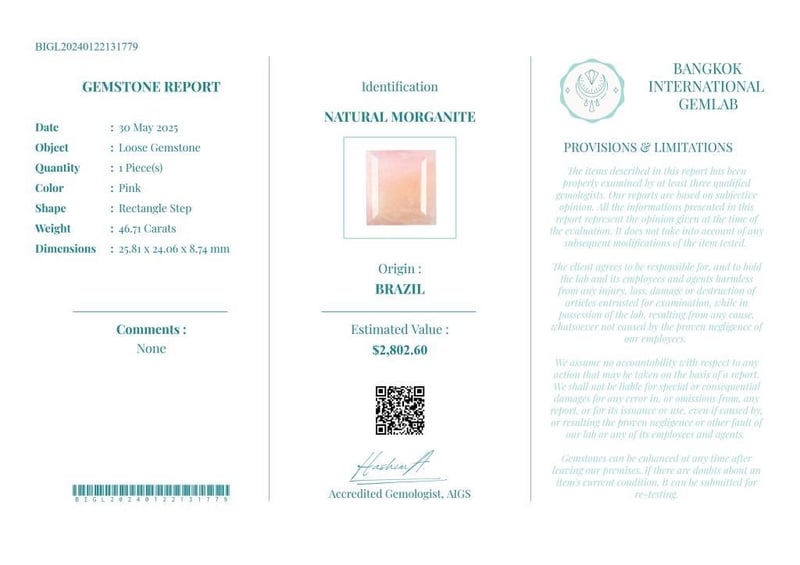 46.71 CARATS CERTIFIED NATURAL MORGANITE Gemstone : Natural MorganiteCertificate Number : Bigl20240122131779Weight : 46.71 CaratsColor : PinkMeasurement : 25.81 X 24.06 X 8.74 MmShape : Rectangle StepQuantity : 1 PieceOrigin : BrazilComments : None• Use The Qr Code On The Packaging To View And Download The Certificate. • Verify Report Online At Www.Bangkokinternationalgemlab.Co 0+5