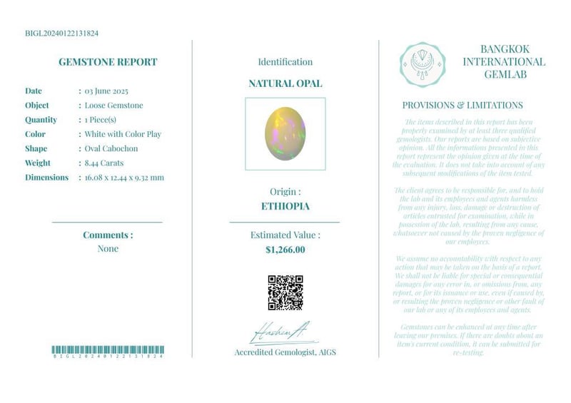 8.44 CARATS CERTIFIED NATURAL OPAL Gemstone : Natural OpalCertificate Number : Bigl20240122131824Weight : 8.44 CaratsColor : White With Color PlayMeasurement : 16.08 X 12.44 X 9.32 MmShape : Oval CabochonQuantity : 1 PieceOrigin : EthiopiaComments : None• Use The Qr Code On The Packaging To View And Download The Certificate. • Verify Report Online At Www.Bangkokinternationalgemlab.Co 0+8