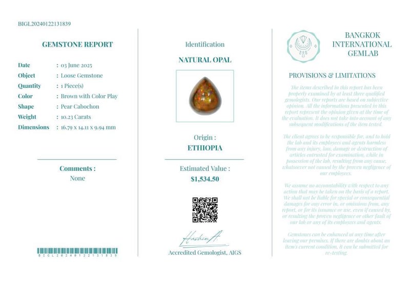 10.23 CARATS CERTIFIED NATURAL OPAL Gemstone : Natural OpalCertificate Number : Bigl20240122131839Weight : 10.23 CaratsColor : Brown With Color PlayMeasurement : 16.79 X 14.11 X 9.94 MmShape : Pear CabochonQuantity : 1 PieceOrigin : EthiopiaComments : None• Use The Qr Code On The Packaging To View And Download The Certificate. • Verify Report Online At Www.Bangkokinternationalgemlab.Co 0+9