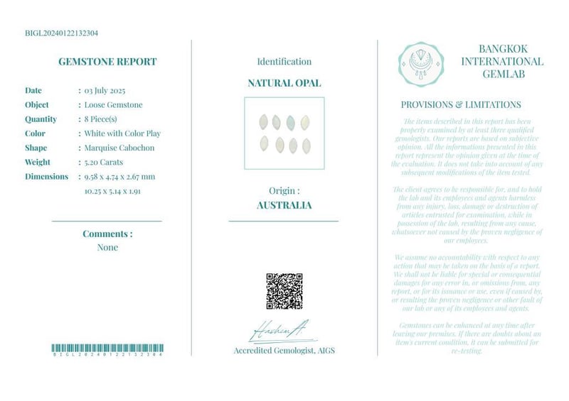 5.2 CARATS CERTIFIED NATURAL OPAL Gemstone : Natural OpalCertificate Number : Bigl20240122132304Weight : 5.2 CaratsColor : White With Color PlayMeasurement : 9.58 X 4.74 X 2.67 MmShape : Marquise CabochonQuantity : 8 PieceOrigin : AustraliaComments : None• Use The Qr Code On The Packaging To View And Download The Certificate. • Verify Report Online At Www.Bangkokinternationalgemlab.Co 0+40