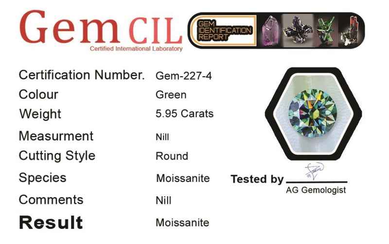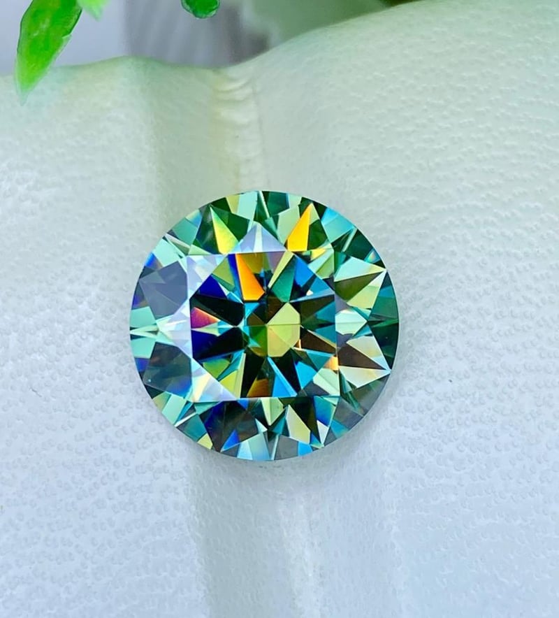 5.95 CARATS SPARKLING MOISSANITE 5.95 Carats Sparkling MoissaniteStone = MoissaniteWeight = 5.95 Carats Colour = GreenCut = RoundLustre = ExcellentNote = Gem Cil, Certified, 0+4