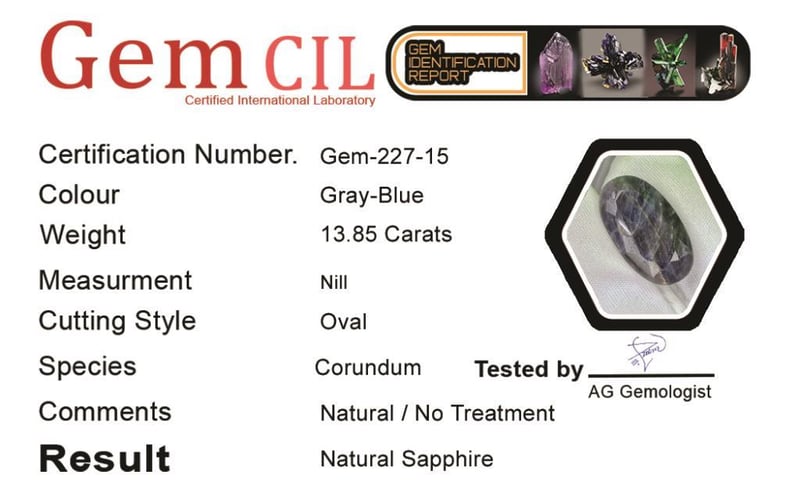 13.85 CARATS NATURAL CERTIFIED SAPPHIRE 13.85 Carats Natural Certified Sapphire Stone = Natural SapphireWeight = 13.85 Carats Cut = Oval Colour = Blue/GrayLustre = ExcellentTreatment = Natural (No Treatment Detected) Note = Gem Cil, Certified, Precise Custom Cut (Not Commercial) 0+15