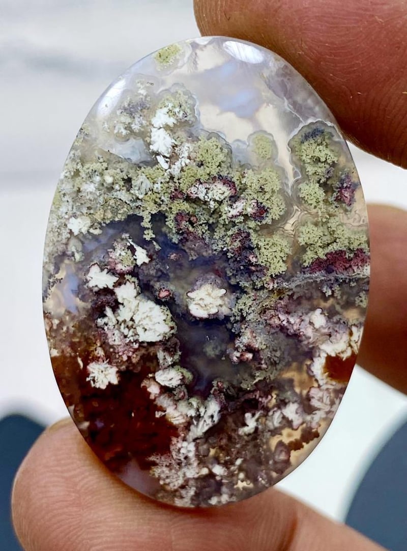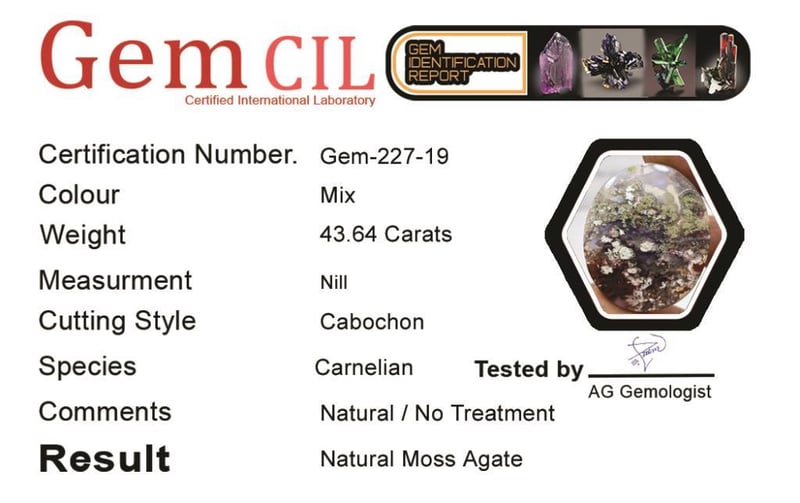 43.64 CARATS NATURAL MOSS AGATE 43.64 Carats Natural Moss AgateStone = Moss AgateWeight = 43.64 Carats Treatment = No Treatment (Natural)Cut = Cabochon Quantity = 1Note = Gem Cil, Certified, 0+19