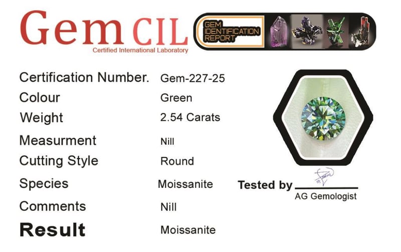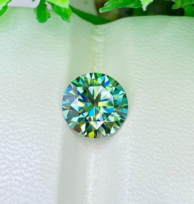 2.54 CARATS SPARKLING MOISSANITE 2.54 Carats Sparkling MoissaniteStone = MoissaniteWeight = 2.54 Carats Colour = GreenCut = RoundLustre = ExcellentNote = Gem Cil, Certified, 0+25