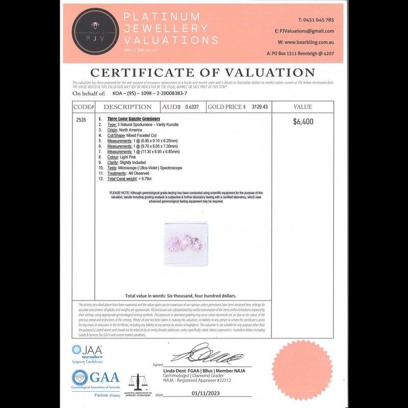 9.79CT TSW X 3, NATURAL KUNZITESCondition: Good - Refer To ImagesInsurance Replacement Valuation Amount: $6,400.00488394+3