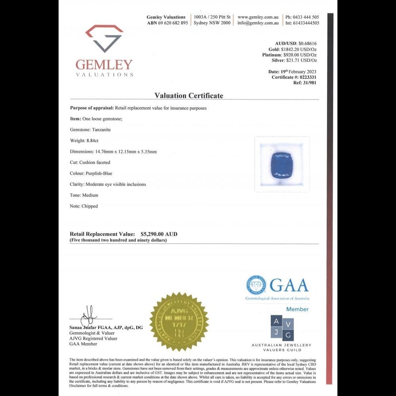 8.84CT TANZANITECondition: Good - Refer To ImagesInsurance Replacement Valuation Amount: $5,290.00488394+6