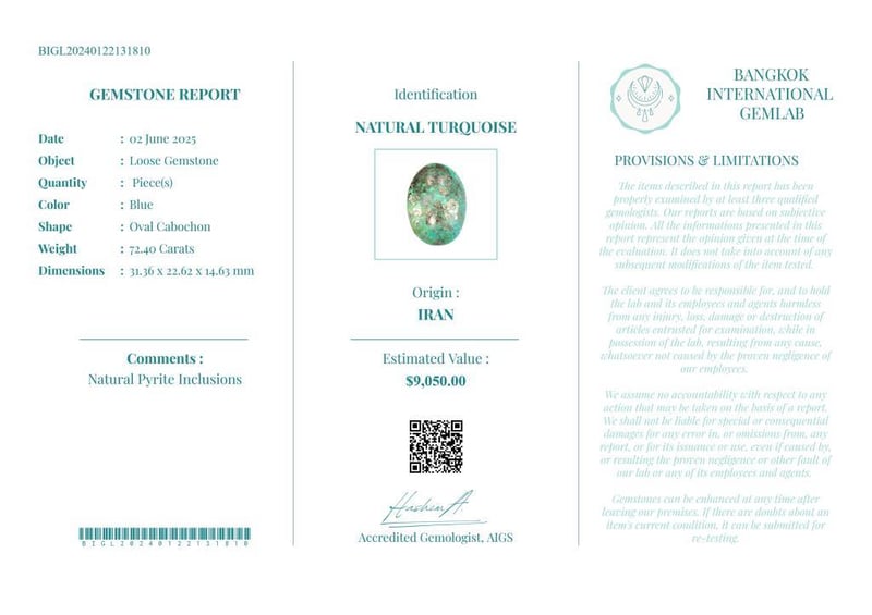72.4 CARATS CERTIFIED NATURAL TURQUOISE Gemstone : Natural TurquoiseCertificate Number : Bigl20240122131810Weight : 72.4 CaratsColor : BlueMeasurement : 31.36 X 22.62 X 14.63 MmShape : Oval CabochonQuantity : 1 PieceOrigin : IranComments : Natural Pyrite Inclusions• Use The Qr Code On The Packaging To View And Download The Certificate. • Verify Report Online At Www.Bangkokinternationalgemlab.Co 0+7