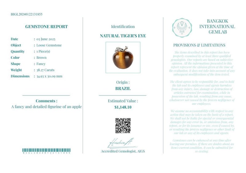 38.27 CARATS CERTIFIED NATURAL TIGER'S EYE Gemstone : Natural Tiger'S EyeCertificate Number : Bigl20240122131855Weight : 38.27 CaratsColor : BrownMeasurement : 34.93 X 30.09 MmShape : FancyQuantity : 1 PieceOrigin : BrazilComments : A Fancy And Detailed Figurine Of An Apple• Use The Qr Code On The Packaging To View And Download The Certificate. • Verify Report Online At Www.Bangkokinternationalgemlab.Co 0+10