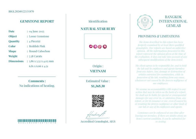 7.38 CARATS CERTIFIED NATURAL STAR RUBY Gemstone : Natural Star RubyCertificate Number : Bigl20240122131870Weight : 7.38 CaratsColor : Reddish PinkMeasurement : 5.86 X 5.52 X 4.03 MmShape : Round CabochonQuantity : 4 PieceOrigin : VietnamComments : No Indications Of Heating.• Use The Qr Code On The Packaging To View And Download The Certificate. • Verify Report Online At Www.Bangkokinternationalgemlab.Co 0+11