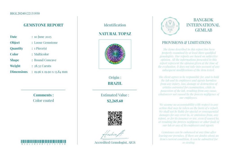 28.32 CARATS CERTIFIED NATURAL TOPAZ Gemstone : Natural TopazCertificate Number : Bigl20240122131930Weight : 28.32 CaratsColor : MulticolorMeasurement : 19.96 X 19.90 X 13.84 MmShape : Round ConcaveQuantity : 1 PieceOrigin : BrazilComments : Color Coated• Use The Qr Code On The Packaging To View And Download The Certificate. • Verify Report Online At Www.Bangkokinternationalgemlab.Co 0+15