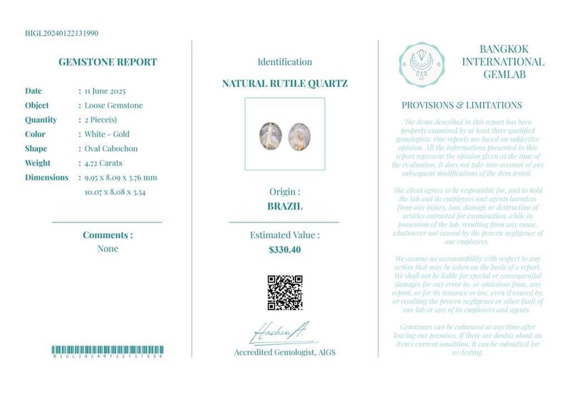 4.72 CARATS CERTIFIED NATURAL RUTILE QUARTZ Gemstone : Natural Rutile QuartzCertificate Number : Bigl20240122131990Weight : 4.72 CaratsColor : White - GoldMeasurement : 9.95 X 8.09 X 3.76 MmShape : Oval CabochonQuantity : 2 PieceOrigin : BrazilComments : None• Use The Qr Code On The Packaging To View And Download The Certificate. • Verify Report Online At Www.Bangkokinternationalgemlab.Co 0+19
