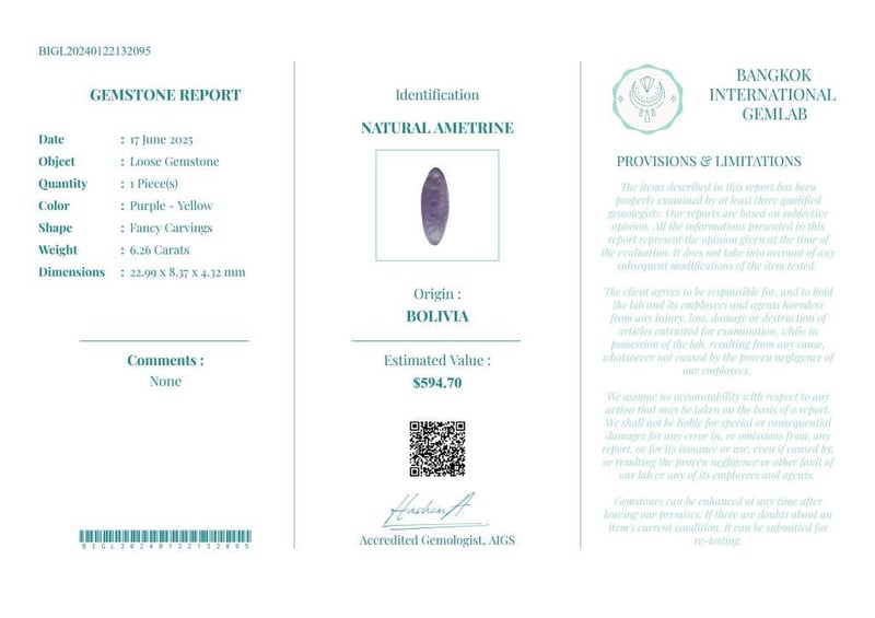 6.26 CARATS CERTIFIED NATURAL AMETRINE Gemstone : Natural AmetrineCertificate Number : Bigl20240122132095Weight : 6.26 CaratsColor : Purple - YellowMeasurement : 22.99 X 8.37 X 4.32 MmShape : Fancy CarvingsQuantity : 1 PieceOrigin : BoliviaComments : None• Use The Qr Code On The Packaging To View And Download The Certificate. • Verify Report Online At Www.Bangkokinternationalgemlab.Co 0+26