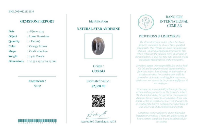 24.62 CARATS CERTIFIED NATURAL STAR ANDESINE Gemstone : Natural Star AndesineCertificate Number : Bigl20240122132110Weight : 24.62 CaratsColor : Orangy BrownMeasurement : 20.79 X 15.03 X 9.27 MmShape : Oval CabochonQuantity : 1 PieceOrigin : CongoComments : None• Use The Qr Code On The Packaging To View And Download The Certificate. • Verify Report Online At Www.Bangkokinternationalgemlab.Co 0+27