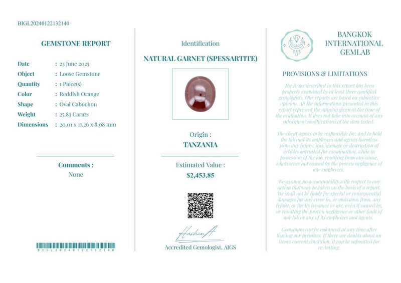 25.83 CARATS CERTIFIED NATURAL GARNET (SPESSARTITE) Gemstone : Natural Garnet (Spessartite)Certificate Number : Bigl20240122132140Weight : 25.83 CaratsColor : Reddish OrangeMeasurement : 20.01 X 17.26 X 8.08 MmShape : Oval CabochonQuantity : 1 PieceOrigin : TanzaniaComments : None• Use The Qr Code On The Packaging To View And Download The Certificate. • Verify Report Online At Www.Bangkokinternationalgemlab.Co 0+29