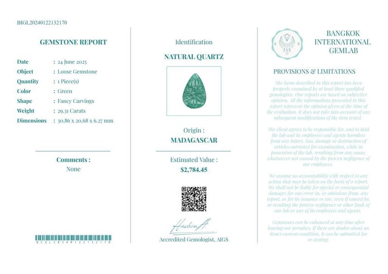 29.31 CARATS CERTIFIED NATURAL QUARTZ Gemstone : Natural QuartzCertificate Number : Bigl20240122132170Weight : 29.31 CaratsColor : GreenMeasurement : 30.86 X 20.68 X 6.27 MmShape : Fancy CarvingsQuantity : 1 PieceOrigin : MadagascarComments : None• Use The Qr Code On The Packaging To View And Download The Certificate. • Verify Report Online At Www.Bangkokinternationalgemlab.Co 0+31