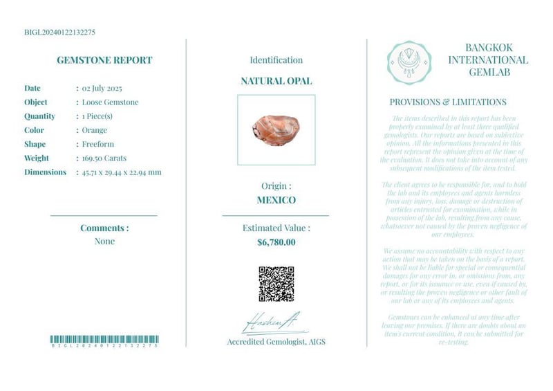 169.5 CARATS CERTIFIED NATURAL OPAL Gemstone : Natural OpalCertificate Number : Bigl20240122132275Weight : 169.5 CaratsColor : OrangeMeasurement : 45.71 X 29.44 X 22.94 MmShape : FreeformQuantity : 1 PieceOrigin : MexicoComments : None• Use The Qr Code On The Packaging To View And Download The Certificate. • Verify Report Online At Www.Bangkokinternationalgemlab.Co 0+38