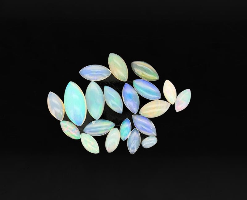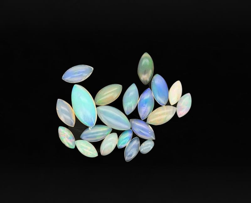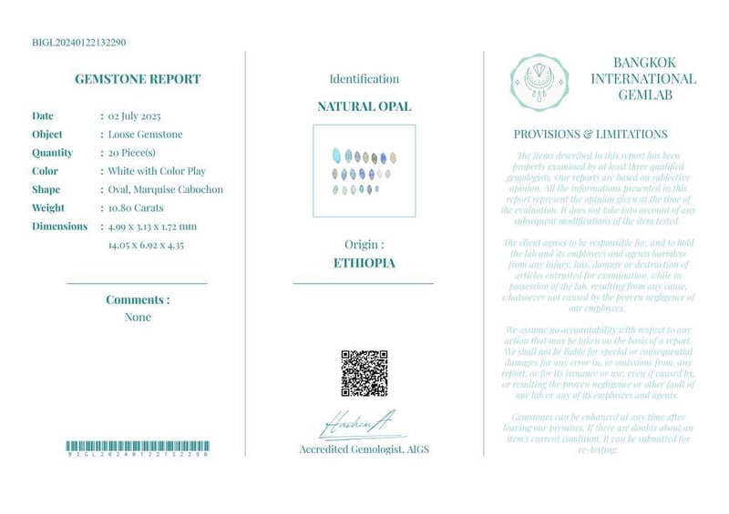 10.8 CARATS CERTIFIED NATURAL OPAL Gemstone : Natural OpalCertificate Number : Bigl20240122132290Weight : 10.8 CaratsColor : White With Color PlayMeasurement : 4.99 X 3.13 X 1.72 MmShape : Oval, Marquise CabochonQuantity : 20 PieceOrigin : EthiopiaComments : None• Use The Qr Code On The Packaging To View And Download The Certificate. • Verify Report Online At Www.Bangkokinternationalgemlab.Co 0+39
