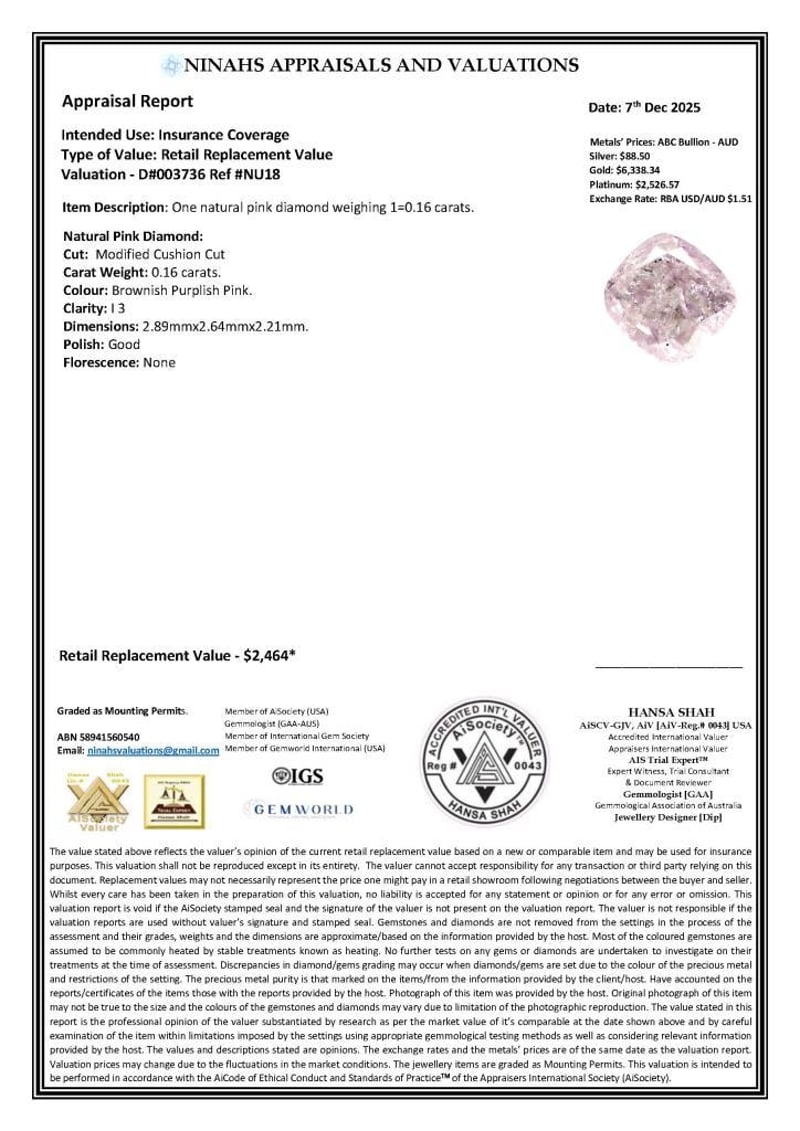 0.16CT PINK CUSHION CUT DIAMOND One Natural Pink Diamond Weighing 1=0.16 CaratsNatural Pink Diamond:Cut: Modified Cushion CutCarat Weight: 0.16 Carats.Colour: Brownish Purplish Pink.Clarity: I 3Dimensions: 2.89Mmx2.64Mmx2.21Mm.Polish: GoodFlorescence: None//Nu18// Valuations Provided by an Independent Third-Party Professional Not Directly Associated With Lloyds Auctions at AUD $2464This valuation has been conducted by an independent third-party professional. The valuation amount is an assessment by the issuing valuer and does not reflect the auction value of the item. Any inquiries regarding the valuation should be directed to the issuing valuer (refer to contact details on the certificate), as Lloyds Auctions has no affiliation or influence over the valuation, the valuer, or the stated amount. Condition: Good - Refer Images 0488846+9
