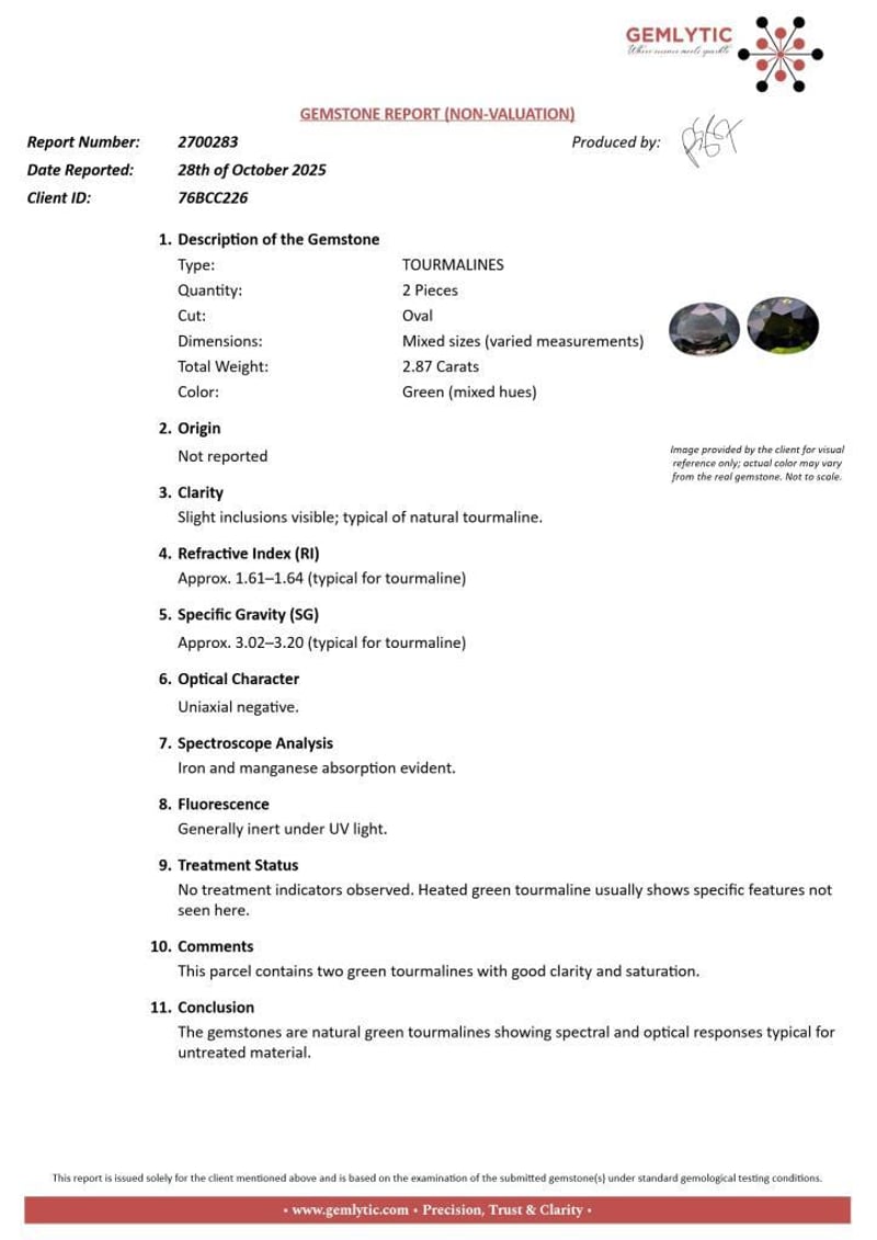TOURMALINES - 2.87 CARATS - GREEN (MIXED HUES) Quantity: 2 PcsReport Number: 2700283Clarity: Slight Inclusions Visible; Typical Of Natural Tourmaline.Measurements: Mixed SizesTreatments: No Treatment Indicators Observed. Heated Green Tourmaline Usually Shows Specific Features Not Seen Here.Origin: Not ReportedRefractive Index: Approx. 1.61–1.64 (Typical For Tourmaline)Specific Gravity: Approx. 3.02–3.20 (Typical For Tourmaline)Spectroscope Analysis: Iron And Manganese Absorption Evident.Fluorescence: Generally Inert Under Uv Light.Comments: This Parcel Contains Two Green Tourmalines With Good Clarity And Saturation.Conclusion: The Gemstones Are Natural Green Tourmalines Showing Spectral And Optical Responses Typical For Untreated Material. Condition: Good - Refer Images 0488396+99