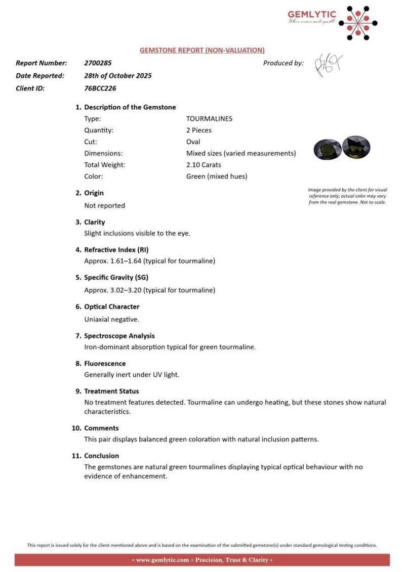 TOURMALINES - 2.10 CARATS - GREEN (MIXED HUES) Quantity: 2 PcsReport Number: 2700285Clarity: Slight Inclusions Visible To The Eye.Measurements: Mixed SizesTreatments: No Treatment Features Detected. Tourmaline Can Undergo Heating, But These Stones Show Natural Characteristics.Origin: Not ReportedRefractive Index: Approx. 1.61–1.64 (Typical For Tourmaline)Specific Gravity: Approx. 3.02–3.20 (Typical For Tourmaline)Spectroscope Analysis: Iron-Dominant Absorption Typical For Green Tourmaline.Fluorescence: Generally Inert Under Uv Light.Comments: This Pair Displays Balanced Green Coloration With Natural Inclusion Patterns.Conclusion: The Gemstones Are Natural Green Tourmalines Displaying Typical Optical Behaviour With No Evidence Of Enhancement. Condition: Good - Refer Images 0488396+101