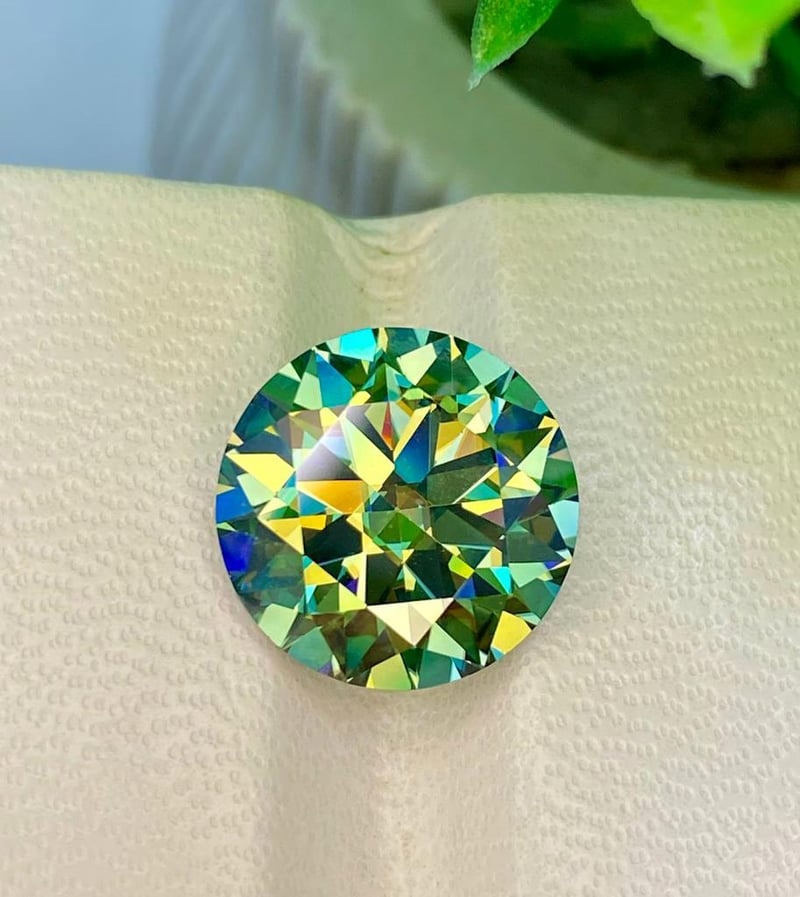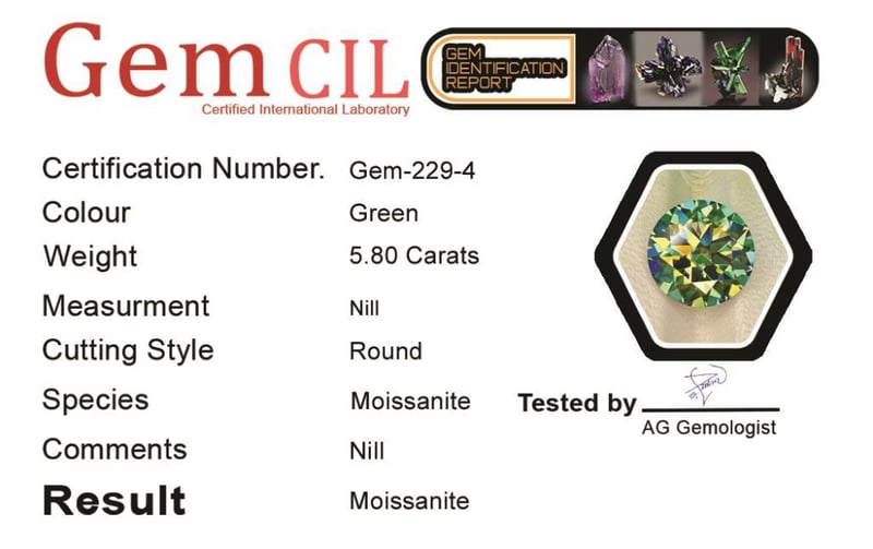 5.85 CARATS SPARKLING MOISSANITE 5.85 Carats Sparkling MoissaniteStone = MoissaniteWeight = 5.85 Carats Colour = GreenCut = RoundLustre = ExcellentNote = Gem Cil, Certified, Condition: Good - Refer Images 0488412+4