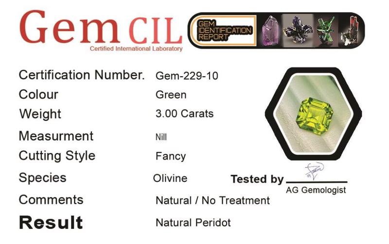 2.76 CARATS NATURAL LUSTROUS PERIDOT 2.76 Carats Natural Lustrous PeridotStone = Natural PeridotWeight = 2.76 CaratsColour = Green Cut = Fancy Note = Gem Cil, Certified, Precise Custom Cut (Not Commercial) Condition: Good - Refer Images 0488412+10