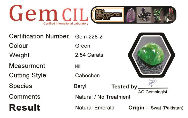 2.54 CARATS NATURAL VIVID GEMMY EMERALD 2.54 Carats Natural Vivid Gemmy EmeraldStone = Natural EmeraldWeight = 2.54 Carats Colour = Green Cut = Cabochon Lustre = Excellent Treatment = No Oil (Natural)Transparency = Transparent Origin = Swat (Pakistan) Note = Condition: Good - Refer Images 0488410+2
