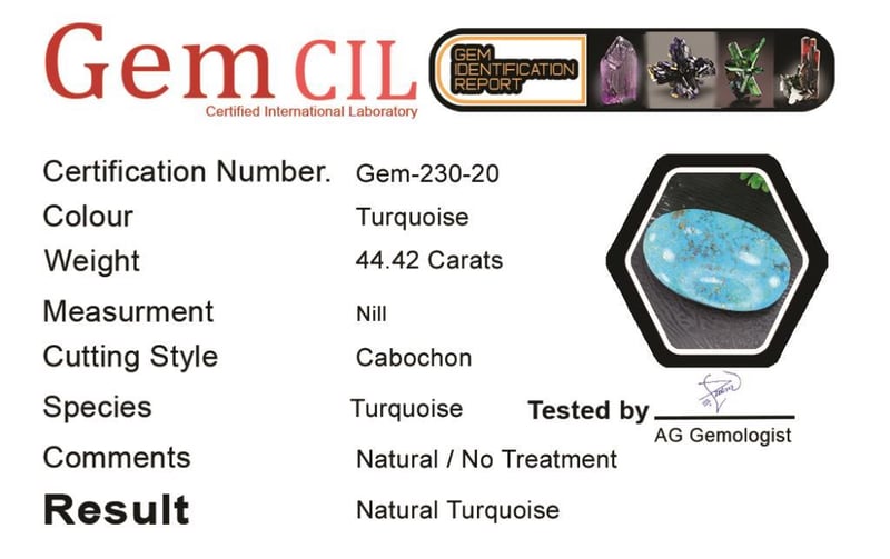 84.10 CARATS NATURAL QUALITY TURQUOISE 84.10 Carats Natural Quality Turquoise Stone = Natural TurquoiseWeight = 84.10 Carats Cut = Cabochon Colour = TurquoiseQuantity = 1Note = Gem Cil, Certified, Condition: Good - Refer Images 0488413+20