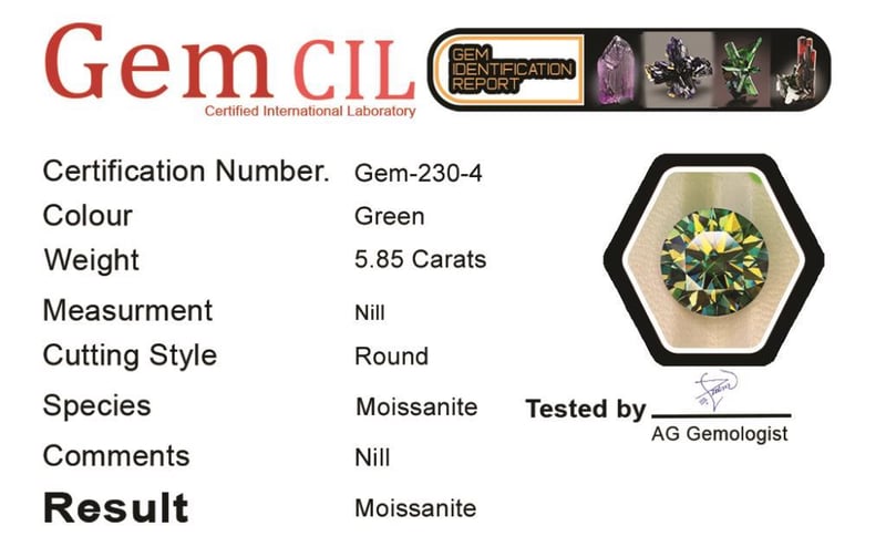 5.85 CARATS SPARKLING MOISSANITE 5.85 Carats Sparkling MoissaniteStone = MoissaniteWeight = 5.85 Carats Colour = GreenCut = RoundLustre = ExcellentNote = Gem Cil, Certified, Condition: Good - Refer Images 0488412+4