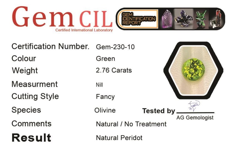 2.76 CARATS NATURAL LUSTROUS PERIDOT 2.76 Carats Natural Lustrous PeridotStone = Natural PeridotWeight = 2.76 CaratsColour = Green Cut = Fancy Note = Gem Cil, Certified, Precise Custom Cut (Not Commercial) Condition: Good - Refer Images 0488412+10